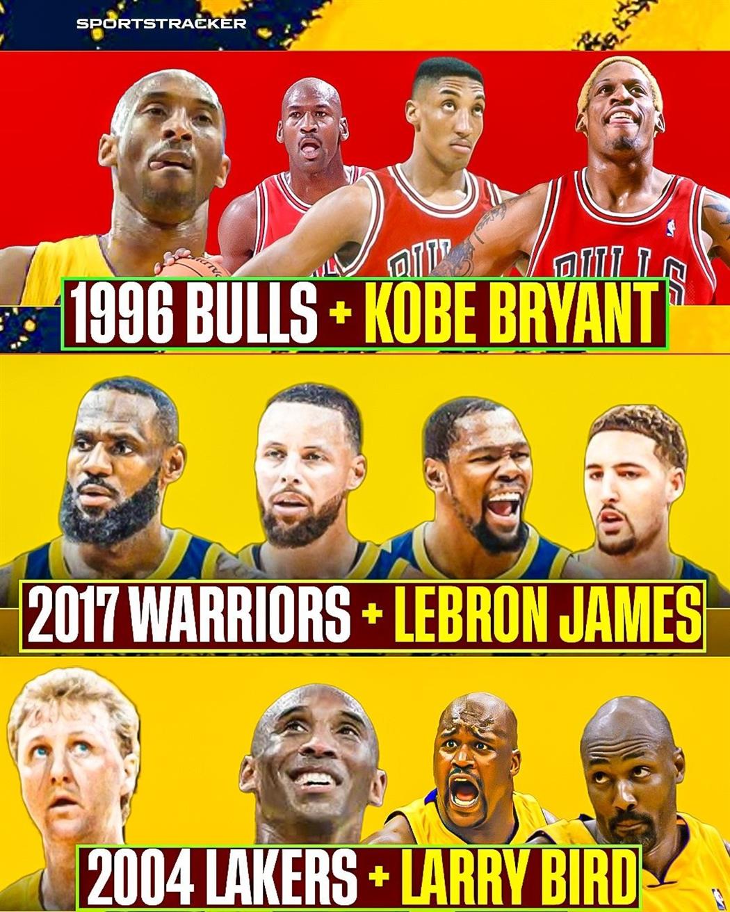 - 96年的公牛加上科比,17年的勇士加上詹姆斯,04年的湖人加上拉里伯德,哪只球队更强?