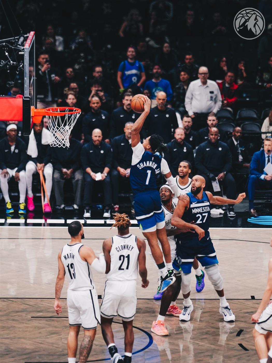 森林狼的戴申·尼克斯在上演滑翔暴扣!森林狼39比40暂时落后篮网1分。