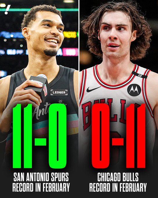 两支球队的对比:马刺队二月份一场未败(11-0) ,而公牛队二月份一场未胜(0胜11负)。遥想乔老爷子当年创立公牛王朝时有多风光,现在的公牛就有多落寞~