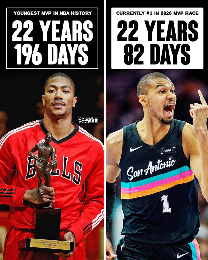 文班亚马已跃居 2026 年 MVP 排行榜榜首,如果他本赛季获胜得MVP,他将超越德里克·罗斯(22岁196天),成为 NBA 历史上最年轻的 MVP!