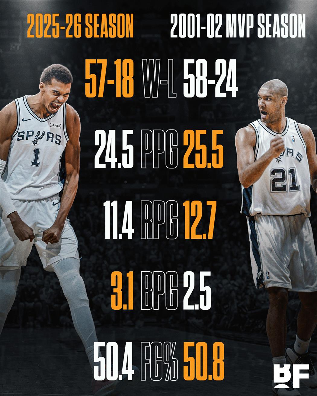 文班亚马这赛季的数据与邓肯当年拿MVP时的数据对比,这个MVP文班是不是稳了?