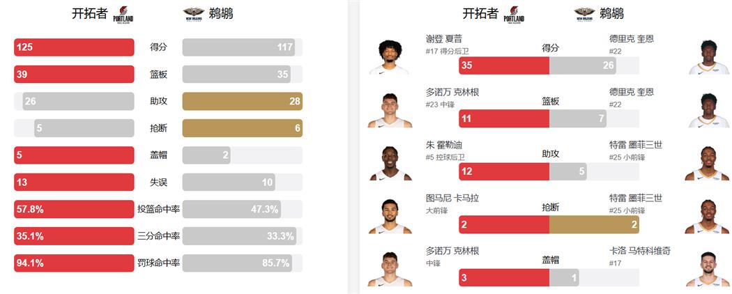 开拓者本场比赛的投篮命中率高达58%,外线三分35投13中,展现出高效的进攻效率。全队共三人得分超过30分,夏普和阿夫迪亚更是同时得分30+,如此火力让鹈鹕难以招架。鹈鹕虽然全场也有五人得分上双,但全队投篮命中率为47%,三分命中率仅33%,与开拓者相比效率明显不足。在篮板球方面,两队争夺激烈,开拓者中锋多诺万·克林根抢下10个篮板,为球队内线提供了坚实保障。