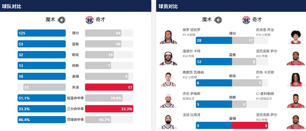 本场比赛,魔术球员表现出色。除了班凯罗的高效表现外,瓦格纳全场得到25分6篮板6助攻3抢断,攻防俱佳。内线温德尔·卡特贡献16分12篮板2盖帽,替补出场的比塔泽也有15分6篮板3盖帽的贡献。球队在防守端表现出色,全队累计完成12次抢断和9次盖帽,彻底遏制了奇才的进攻。奇才方面,凯肖恩·乔治得到全队最高的17分,CJ·麦科勒姆贡献13分5篮板。榜眼秀萨尔拿到10分8篮板3盖帽,但难以改变球队整体低迷的状态。