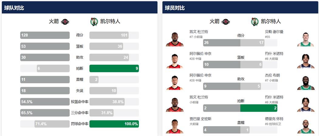 火箭队本场取胜关键在于全员发挥,七人得分上双。除杜兰特、申京和汤普森外,小贾巴里·史密斯贡献12分6篮板4封盖的全面数据。约什·奥科吉得到12分,替补登场的塔里·伊森和里德·谢泼德各有12分进账。球队三分命中率高达66%,全场命中18记三分球,彻底击溃凯尔特人防线。凯尔特人方面,新秀谢尔曼得到全队最高的17分5篮板。佩顿·普里查德贡献14分4助攻,杰伦·布朗仅有12分5助攻进账,德里克·怀特更是11投2中,只得到5分。