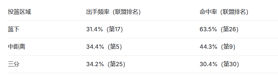 独行侠投篮分布详表