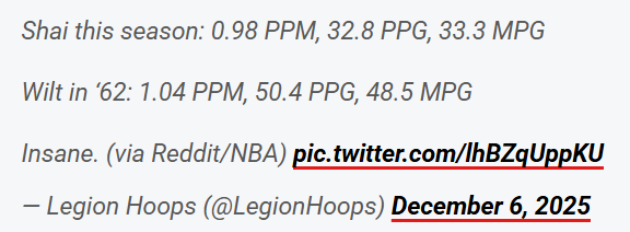 打球吗NBA讯 2025-26赛季的NBA赛场上,谢伊·吉尔杰斯-亚历山大正以历史级得分效率书写传奇。根据Basketball-Reference的数据,他本赛季每分钟可得到0.98分,创下自威尔特·张伯伦在1961-62赛季场均1.04分(每分钟)以来,NBA联盟球员中的最高纪录。即使对比乔尔·恩比德在2023-24赛季创造的近代篮球最高效表现(每分钟1.03分),SGA的数据仍稳居历史顶级行列。