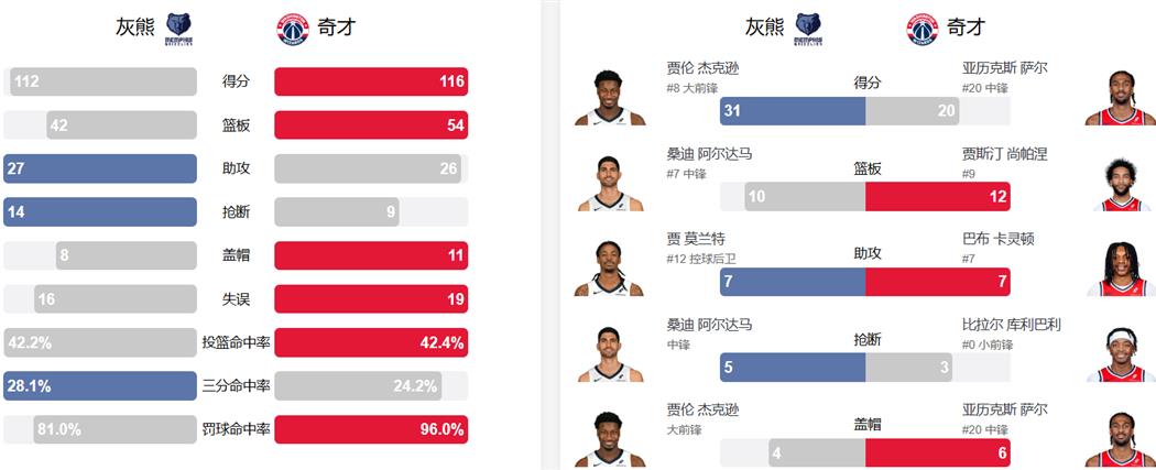 - 贾伦·杰克逊空砍31分 灰熊客场112比116不敌奇才