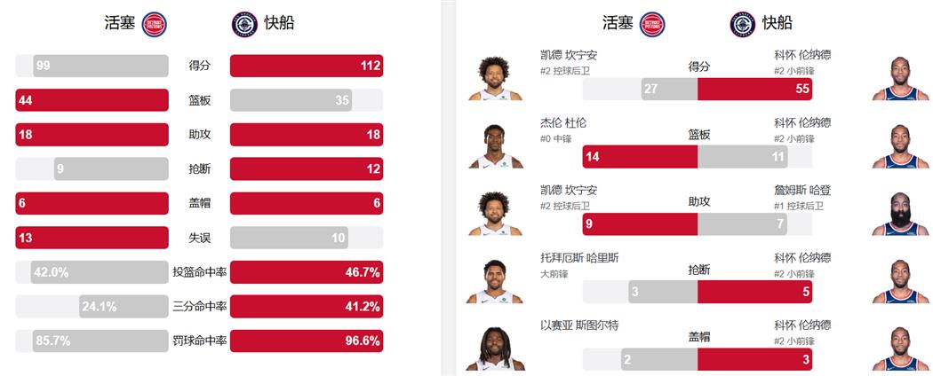 打球吗NBA讯 北京时间12月29日,NBA常规赛继续进行,洛杉矶快船坐镇主场迎战底特律活塞。凭借科怀·伦纳德历史级的个人表现,快船以112-99战胜对手,收获四连胜。活塞则遭遇两连败。