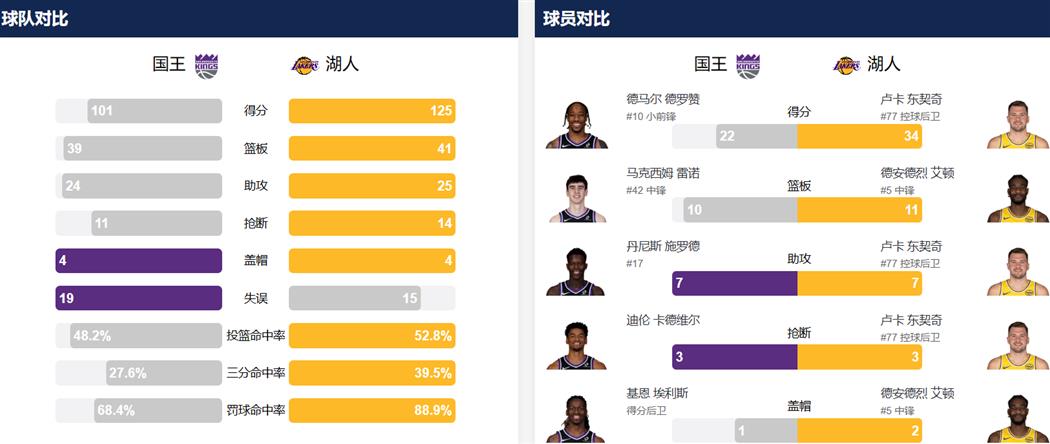 - 东契奇和詹姆斯合砍58分 带领湖人125比101轻取国王