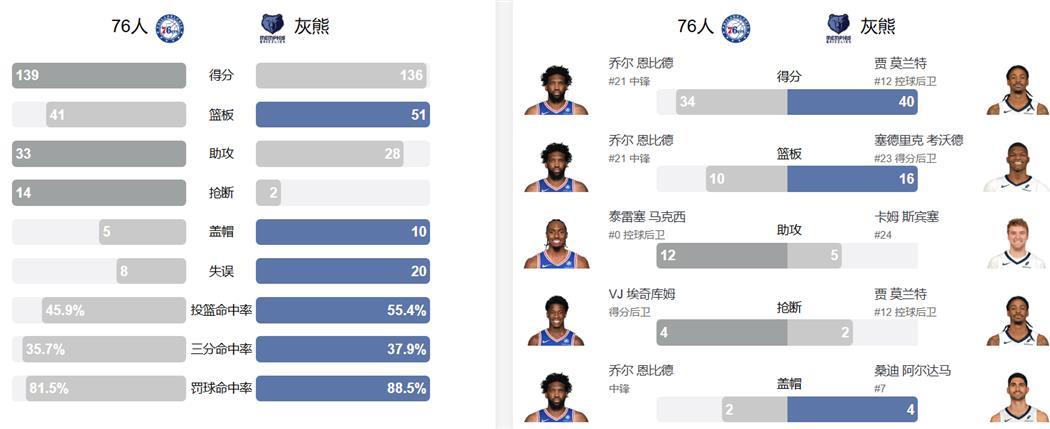 - 76人客场139比136险胜灰熊 终结了球队三连败