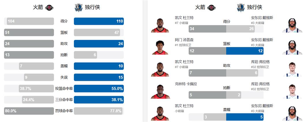 比赛的转折点出现在第二节。火箭进攻效率骤降,而独行侠在安东尼·戴维斯的率领下打出一波32-19的得分高潮,一举反超对手并建立起了7分的领先优势。下半场,独行侠延续良好状态,第三节将分差扩大至12分。末节决战,独行侠曾一度将领先优势扩大到17分。尽管杜兰特率队展开顽强反扑,一度将分差迫近,但他关键时刻的失误以及最后一分钟追平比分的三分球不中,让火箭翻盘未果。最终,独行侠主场收获一场关键胜利。