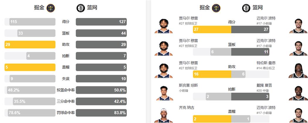 篮网本场取胜关键在于团队发挥,全队共有6人得分上双。小波特面对旧主砍下全场最高的27分,并贡献11个篮板和5次助攻;新秀克洛尼表现抢眼,得到22分6篮板;夏普和小托马斯分别贡献17分,前者还有3次抢断。掘金方面,穆雷打出惊艳表现,独得27分6篮板,并送出创个人职业生涯新高的16次助攻,其生涯总助攻数也借此升至队史第五位,成就里程碑之夜。小哈达威得到26分,复出的戈登替补出场贡献20分6篮板,沃特森也有23分进账。四人得分20+仍难救主,凸显了球队在防守端和阵容深度上的不足。