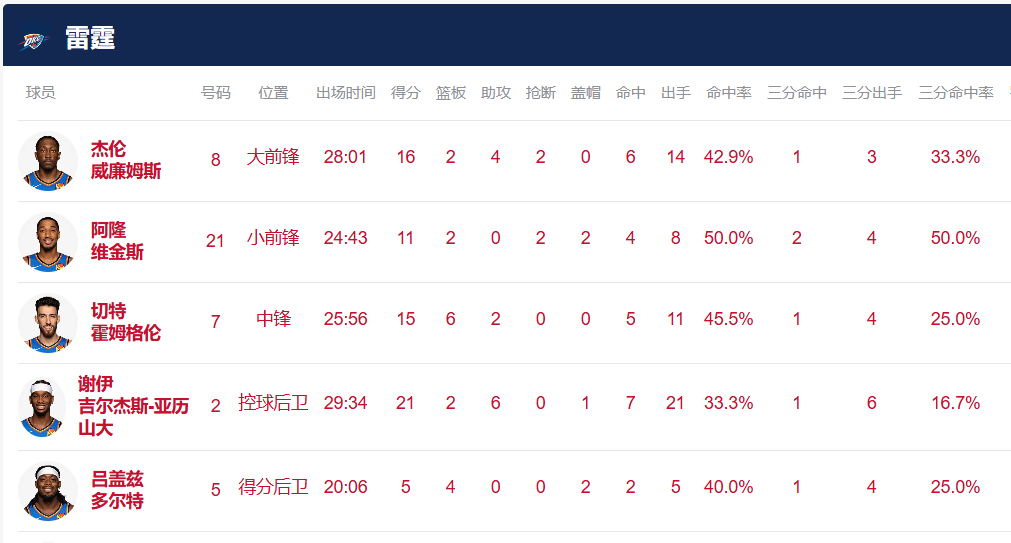 本场比赛,雷霆全队状态低迷。虽然核心谢伊·吉尔杰斯-亚历山大延续了连续108场比赛得分20+的纪录,但他手感冰凉,21投仅7中,三分球6中1,得到21分6助攻,个人正负值低至-20。球队全场仅得97分,创下本赛季单场得分新低;净负27分,则是本赛季主场最大输球分差。从赛季初前25场狂揽24胜,到最近12场仅取得6胜6负,雷霆的统治力显然出现了松动。