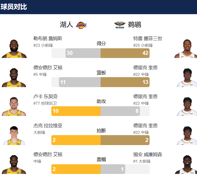 数据方面,湖人队詹姆斯砍下30分、8篮板、8助攻的全面数据,并在决胜阶段统治比赛;东契奇贡献30分、10助攻,德安德烈·艾顿得到18分、11篮板,马库斯·斯马特也有13分入账。鹈鹕队虽失利,但特雷·墨菲迎来爆发,空砍生涯新高的42分,并有5篮板;锡安·威廉姆森得到15分,约瑟·奎因贡献10分、13篮板、8助攻的准三双。