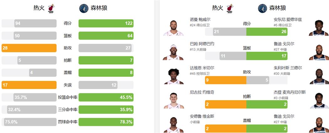 - 爱德华兹发挥出色 带领森林狼主场122比94大胜热火