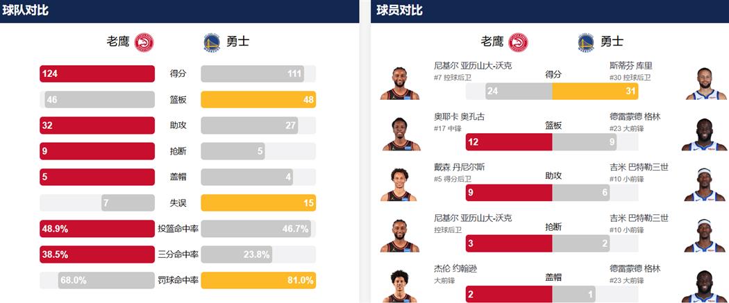 此役,老鹰队展现了出色的团队篮球。朗德罗·沃克得到全队最高的24分,杰伦·约翰逊贡献23分11篮板6助攻的全面数据,卢克·肯纳德外线手感火热拿下22分,奥涅卡·奥孔古也有18分12篮板7助攻的准三双表现。全队三分球命中率与命中数均优于勇士,多命中5记远投成为取胜关键。