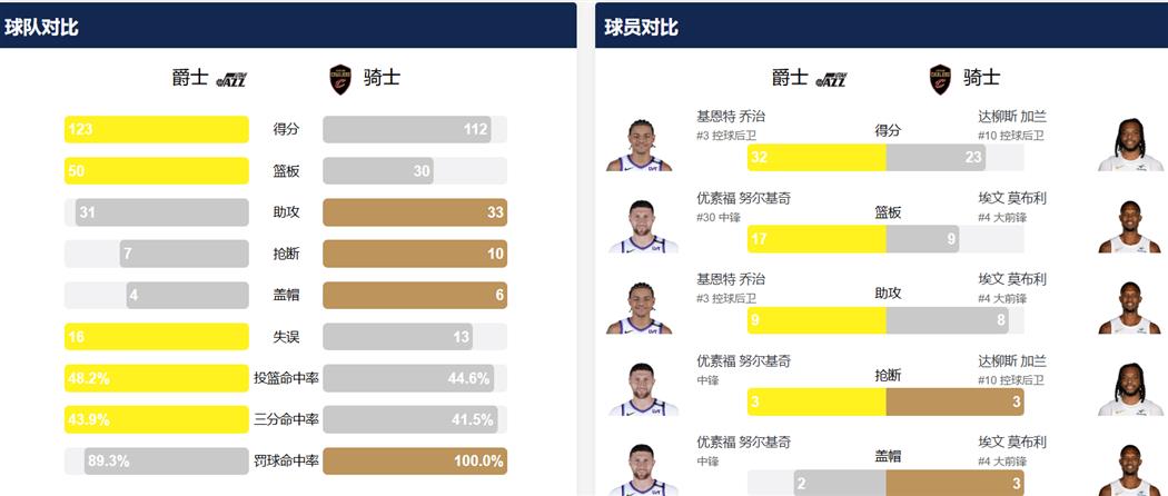 - 爵士客场爆冷123比112战胜骑士