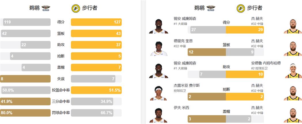 - 步行者主场127比119战胜鹈鹕 把联盟倒数第一的位置送给了对手