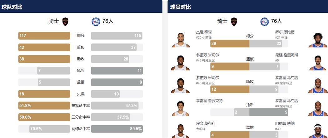 除了泰森的爆发,米切尔本场贡献13分、9篮板和12助攻的准三双数据,莫布利得到15分5篮板并命中制胜球,亨特也有16分进账。76人方面,乔尔·恩比德空砍33分5篮板,马克西得到22分5篮板9助攻,乔治和格里姆斯各得14分。