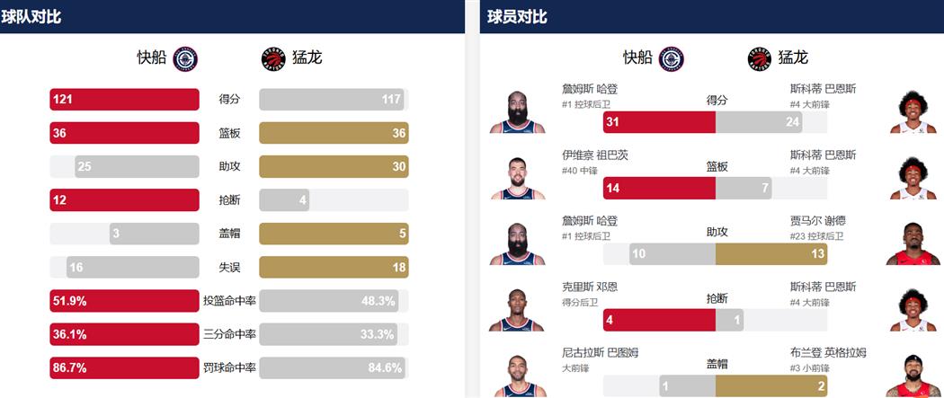 面对缺少多位主力的猛龙队,快船开局慢热,首节一度以4-18落后。尽管此后苦苦追赶,但三节结束时仍落后11分。比赛的转折点出现在第四节,快船打出强硬防守与高效反击,单节轰出31分,其中哈登在最后阶段连得6分,帮助球队在常规时间结束前追平比分。虽然他最后的压哨中投未能命中,将比赛拖入加时,但已然重振球队士气。