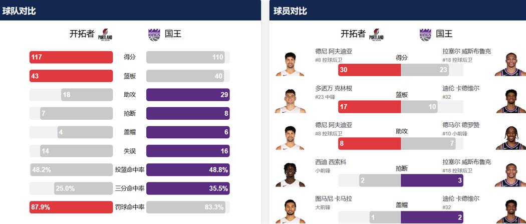 打球吗NBA讯 北京时间1月19日,NBA常规赛继续进行,波特兰开拓者客场以117-110力克萨克拉门托国王,实现本赛季对对手的“三杀”,同时迎来三连胜,而国王的四连胜势头则遭终结。