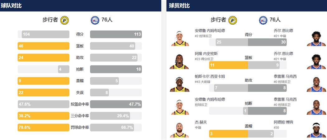 本场获胜后,76人终结了此前的两连败。而步行者则在缺少哈利伯顿、马瑟林等主力的情况下遭遇两连败,继续在东部排名垫底。双方本赛季的两次交锋均以76人取胜告终。