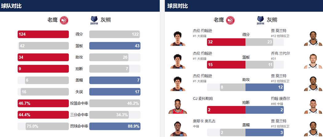老鹰队本场取胜头号功臣当属杰伦-约翰逊,他全场贡献32分、15个篮板和8次助攻的准三双全能数据,并在最后时刻命中价值连城的三分。奥孔古得到18分9篮板,肯纳德三分神准射下18分,麦科勒姆也有15分6助攻入账。灰熊方面,莫兰特空砍23分并送出全场最高的12次助攻,另有3次封盖。小贾伦-杰克逊得到17分6篮板,科沃德贡献17分7篮板,韦尔斯拿下18分,兰代尔则有13分11篮板的两双表现。