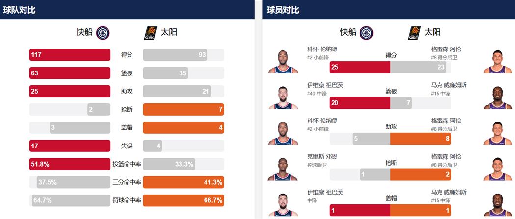 太阳队:格雷森·阿伦得到全队最高的23分并送出8次助攻,狄龙·布鲁克斯得到22分5篮板,但其他球员给予的支持有限,未能抵挡住快船队的整体攻势。
