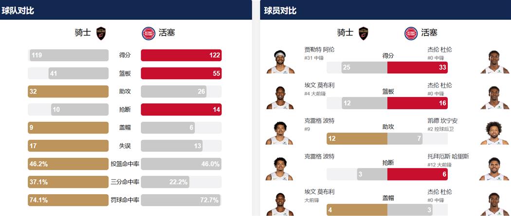 杜伦本场展现了内线统治力,33分创下个人赛季新高,16个篮板中有7个前场篮板,多次在关键时刻为球队创造二次进攻机会。坎宁安虽然六犯离场,但全场25+10+7的全面表现依然是球队能够坚持到加时的重要保障。詹金斯关键时刻三罚全中的大心脏表现,也成为比赛转折点之一。骑士尽管多名主力缺阵,但阿伦和莫布利的双塔组合依然给活塞制造了巨大麻烦,两人合计贡献48分21篮板8封盖。只是末节和加时赛关键时刻的罚球失准和三分不中,最终葬送了胜局。