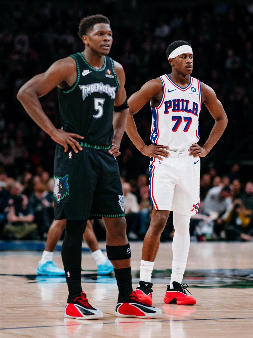 笔者曾在夏联时盛赞过埃奇库姆高产高效的中距离跳投,其略带飘逸的后仰及投篮手型还有点安东尼·爱德华兹的影子。然而,自热身赛到赛季前段,埃奇库姆的中距离出手数及出手意愿极低,有空档也不会出手,宁愿选择往油漆区做命中率三成出头的抛投。然而,到了赛季中期埃奇库姆似乎逐渐明白他的攻筐劣势不是短期内可以改变的事情,反倒是他优秀的中距离投射技能包可以拿出来运用。自1/20对上太阳的比赛,埃奇库姆单场以九投五中的中距离攻下25分后似乎开启了他的中距离开关。埃奇库姆不只会时不时在恩比德缺阵的情况下用大量中距离pull-ups接管比赛,如2/3对上勇士又用九投五中的两分pull-ups攻下25分之外,他整体的pull-ups出手频率(两分及三分)也在二月显著增加,多次运球及更长触球时间的出手也在增加,在保持快攻出手频率的情况下,减少的正是阵地战硬切的低效油漆区出手。