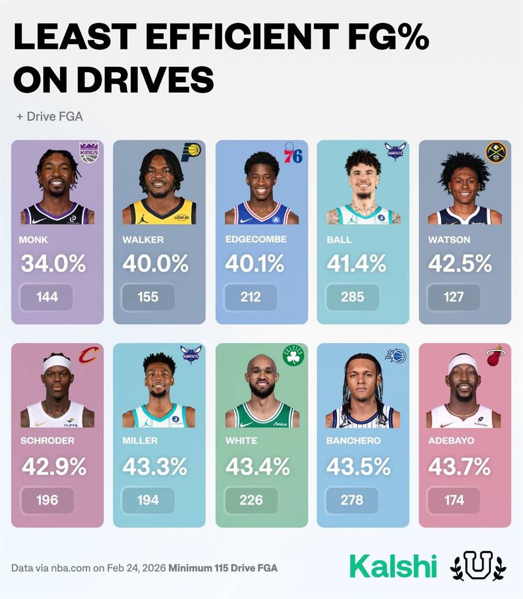 接着看到进攻端,埃奇库姆本季场均可以攻下15.2分4.0助攻,但投篮三围43/36/81并不算出色,真实命中率更只有联盟后段班的53.6%,这其中最大的问题就出在埃奇库姆的攻框能力了。以一名身体素质优秀的侧翼球员来说,54.7%的篮下命中率(PR12)以及40.1%的切入命中率真的太低了,而原因也与季前的分析相仿,埃奇库姆的运球节奏单调无法过掉防守者,同时进到油漆区总习惯提早收球靠弹跳与滞空硬上,却也没有像马克西足够好的远距离挑篮或抛投,切入抛投的命中率仅有36.7%、近筐命中率也仅有36.8%,这使得防守者相当好去干扰同时还能避免犯规,这也是为什么埃奇库姆在切入的命中率及罚球数量会那么低的(会整天想要远距离隔扣对手)原因。