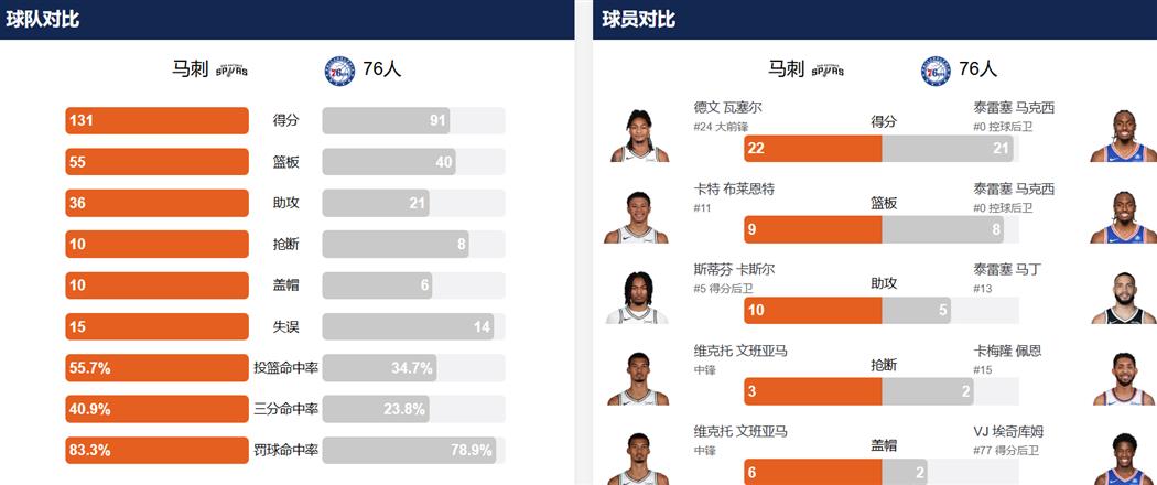 马刺全队多点开花,六人得分上双:瓦塞尔22分,哈珀22分,卡斯尔15分10助攻,凯尔登·约翰逊12分9篮板,卡特·布莱恩特11分,文班亚马10分8篮板4助攻3抢断6盖帽,尚帕涅10分。76人方面,马克西空砍21分,贾巴里·沃克20分,佩恩10分,其他球员贡献有限。德拉蒙德7投仅1中得到2分,三分球4中0;巴洛4投0中一分未得。