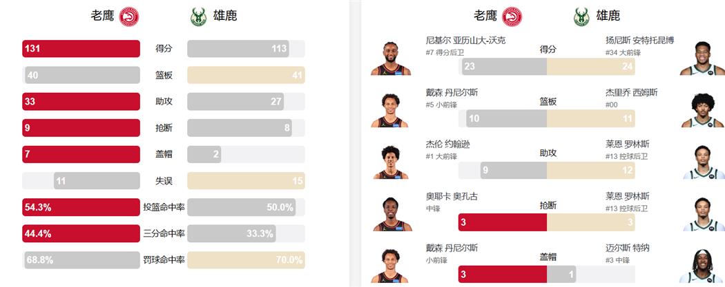 - 字母哥空砍24分 老鹰客场131比113逆转大胜雄鹿