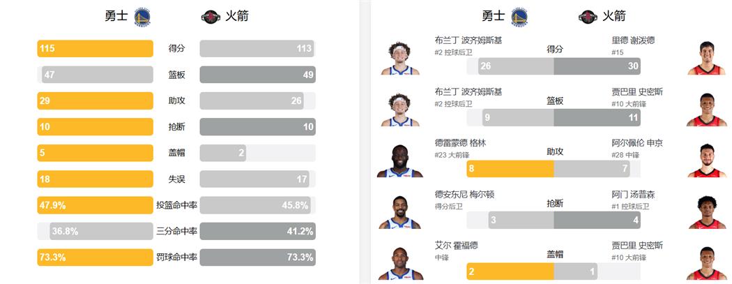 数据方面,勇士的波齐姆斯基砍下26分9篮板,梅尔顿贡献23分6篮板3抢断并在加时赛完成致命补篮,霍福德得到17分6篮板5助攻,格林有10分5篮板8助攻入账。火箭方面,谢泼德替补爆发轰下全场最高的30分并送出6次助攻,汤普森拿下18分10篮板5助攻4抢断的全面数据,杜兰特面对旧主贡献23分6篮板3抢断,申京得到17分7篮板7助攻。