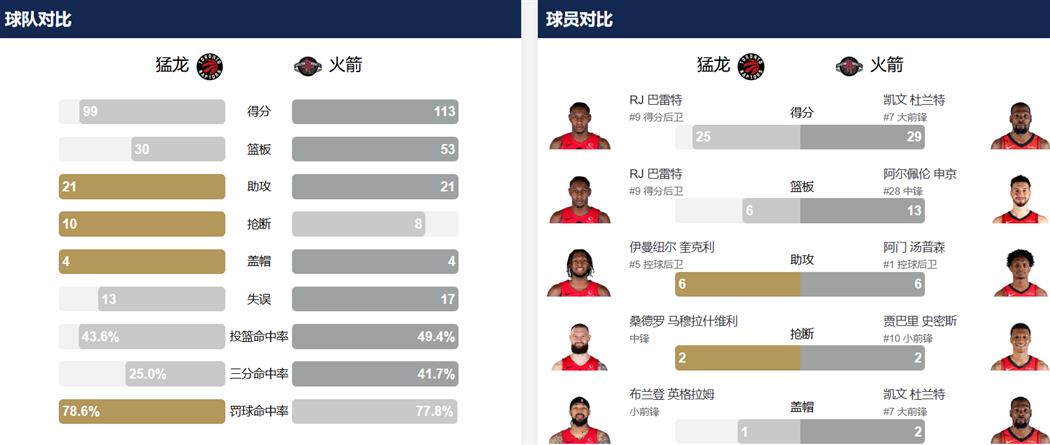 易边再战,火箭开局一度领先10分,但随后球队防守强度有所下滑,猛龙抓住机会缩小分差。尽管杰伦-格林继续保持火力,三节战罢已拿到27分,但猛龙凭借巴恩斯和巴雷特的发挥,将比分追至83-86,仅落后3分进入末节。末节决战,火箭没有再给对手机会。申京在快攻中完成精彩暴扣并打成2+1,阿门-汤普森命中三分,贾巴里-史密斯抢断后暴扣得手,随后又面对英格拉姆打成2+1,一人连拿8分彻底点燃客场替补席。火箭打出一波25-10的超级攻击波,将分差拉开至18分,比赛悬念就此终结。最后2分多钟,猛龙率先换下主力放弃抵抗,火箭最终以113-99大胜对手。