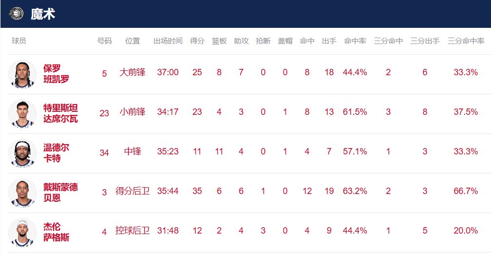 全场比赛,魔术共有三人得分20+,成为击败骑士的关键。贝恩轰下全场最高的35分6篮板6助攻,仅有1次失误,末节最后18秒命中三分并两罚全中,是球队获胜的首功之臣。班凯罗贡献25分8篮板7助攻的准三双数据,多次强突造杀伤。席尔瓦也有23分4篮板3助攻入账,末节两记关键三分外加罚球,持续回应骑士的反扑。