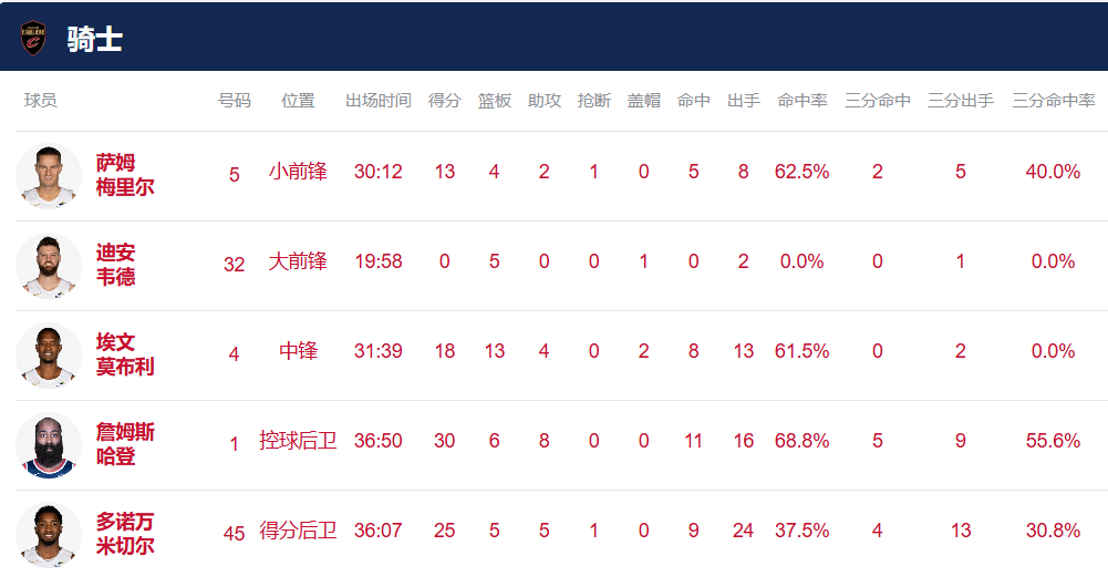 - 哈登米切尔合砍55分 骑士客场122比128惜败魔术