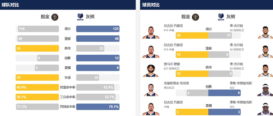 - 约基奇准三双 灰熊爆冷125比118战胜灰熊