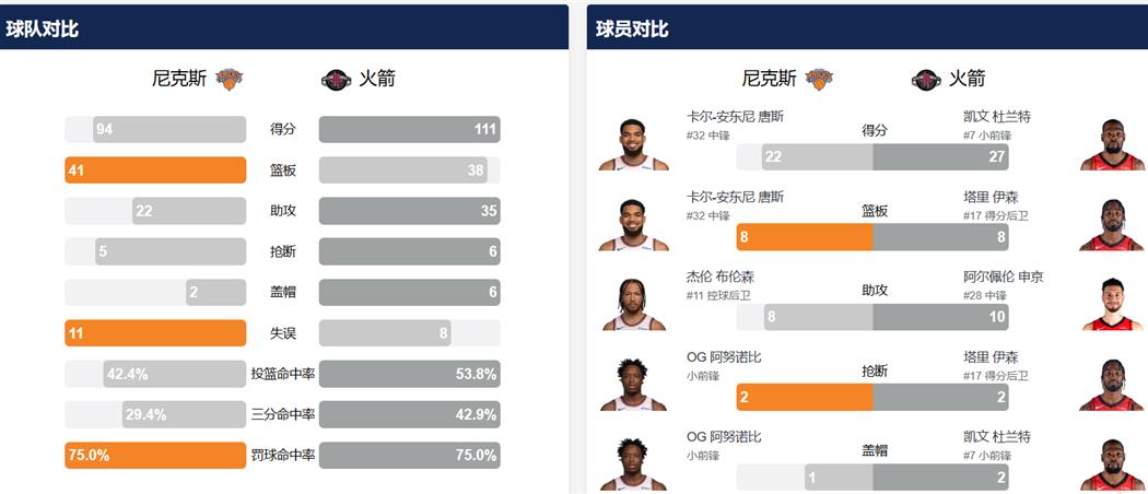 球员数据方面,火箭表现全面。杜兰特全场发挥出色,投篮18中10,三分7中4,罚球4中3,贡献27分6篮板8助攻2盖帽的全面数据,正负值高达+28,成为球队取胜的头号功臣;谢泼德替补出战表现亮眼,砍下20分5篮板,在第二节关键时段为球队稳住局势;阿门-汤普森和申京也有不俗发挥,分别贡献17分4篮板8助攻和13分5篮板10助攻,为球队进攻串联提供有力支撑;伊森重回首发交出亮眼答卷,攻防两端均有出色表现,助力球队奠定胜局。尼克斯方面则表现不佳,核心球员唐斯砍下22分8篮板,哈特和布伦森分别贡献13分5篮板和12分6篮板8助攻,但球队整体进攻效率不高,防守端未能有效限制火箭的进攻火力,最终无奈失利。
