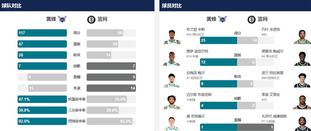 数据方面,此役黄蜂六人得分上双,进攻端多点开花。米勒贡献全场最高的25分,布里奇斯得到19分5篮板4抢断,鲍尔拿下14分7篮板9助攻的全面数据,怀特贡献16分5助攻,迪亚巴特贡献10分12篮板的两双,威廉姆斯也有10分入账。篮网方面,米诺特得到14分,约翰逊和鲍威尔各取11分和10分,特拉奥雷和威廉姆斯分别贡献10分。