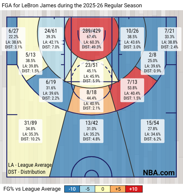 从投篮分布来看,近两年老詹在篮下开发出手的能力已经明显衰退,生涯场均篮下出手次数为6.7次,巅峰期可达7~8次,然今年此数字只剩4.5次,且多数皆为快攻出手,在阵地战硬扛防守者杀入禁区取分对于一位四旬老头还是过于苛责。然而好消息是,尽管开发出手能力不如巅峰,勒布朗仍维持极高的篮下终结效率,勒布朗自从进入巅峰后篮下投篮命中率从未低于70%,而今年依旧维持78%的高效水准,这也是勒布朗在进攻端的基本盘。