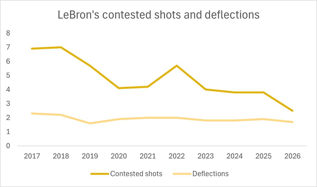 除此之外,勒布朗依旧展现极高的对位弹性,防守后卫、前锋、中锋的时间约40% / 50% / 10%,毕竟6尺9寸、250磅的身材摆在那里也足以让勒布朗守住大部分联盟平均水平的球员。老詹对防守的投入程度也可以从一些拼抢数据来观察,老詹的干扰传球与干扰投篮在近年来逐渐下滑,且干扰投篮在今年更是断崖下降,老詹在第二段骑士的次巅峰时期仍有场均7次左右的干扰投篮,而在湖人大多数时期可维持约4次,今年则仅剩下2.5次,说明尽管防守责任已大幅降低,老詹的防守表现还是乏善可陈。篮板方面,勒布朗今年防守篮板率18.3%仅略低于生涯平均,从更能反映篮板争抢能力的对抗防守篮板来看,场均1.1个较去年1.5个有所下滑,但整体还算是有维持过往生涯水准,可以说明勒布朗篮板能力并没有随着岁月下滑太多。