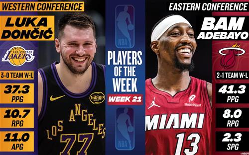 - 卢卡・东契奇和巴姆・阿德巴约分别当选周最佳球员