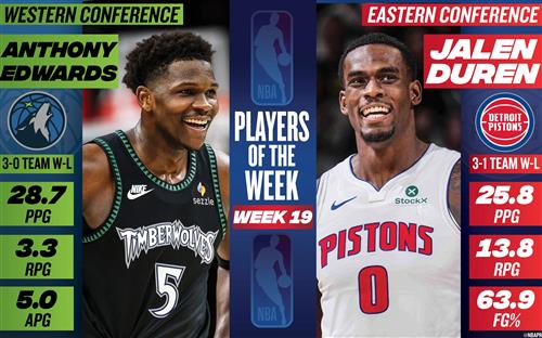 - 活塞中锋杰伦·杜伦和森林狼后卫安东尼·爱德华兹分别当选东西部周最佳球员