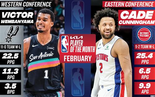 - 坎宁安和文班亚马分获东西部月佳球员